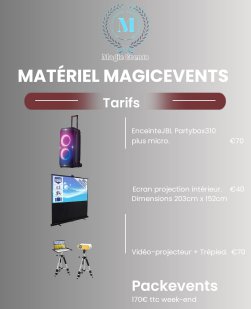 *Des Équipements de Qualité :* Chez Magicevents, nous nous engageons à fournir du matériel en excellent état, afin de garantir le succès de votre événement. Tous nos équipements sont soigneusement entretenus et vérifiés avant chaque location, vous assurant ainsi une expérience sans tracas.